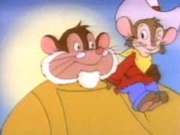 Back at Green River, Fievel sneaks into the barn Tiger's being imprisoned in, and wonders what the Lonesome Ranger would do. He sees a dog chewing on a bone in the alley. Using his lasso, he ropes the bone and slings it into the barn, The angry dog follows it, attacking Waul and the other cats just after they capture Fievel. Fievel frees Tiger. After they escape to the roof, Fievel decides to pay those cats back. In the meantime we get a shot of Cyrus and Papa leaving the festival in a boat, Cyrus ranting about capturing crocodiles in the outback along the way. In the next scene, Waul and Sweet William's gang gather in the barn again, wondering what to do next. Sweet William comes up with a plan to gang up on Fievel, forcing Waul to participate even though he'd rather stay behind and nap. But Fievel is ready for them. When he sees William's two lackies digging around for him, Fievel motions Tiger to lower a mirror from the roof. He then takes out his cork guns and taunts the cats, even repeating his "I'm talkin' to YOU furhead!" line from Fievel Goes West. The two cats run at the mirror image of Fievel and bump heads. Fievel then ties them up. But just then he sees Waul and Sweet William running at him! They chase Fievel back into the barn, and Sweet William forces Waul to go in after Fievel by himself. When he does, Fievel jumps onto a pair of scissors which cuts a rope and causes a bale of hay to land on Waul. He stumbles out and into a wagon. So Sweet William decides to go after Fievel himself. Fievel's next plan of action? He dresses Tiger up like a mouse to scare William away. But it backfires, as William sees the mouse version of Tiger as just more food to eat. He slaps Tiger's disguise off and runs after Fievel, leaving Tiger to spin around and comically flop over. William chases Fievel into a mouse-sized store and crawls in after Fievel, but Fievel pulls a few strings which dump oil and flour on him, leaving William coughing and hacking, stumbling towards the nearest water source. After washing his face he sees Waul still sitting in the hay wagon, and angrily pounces on him. As the two struggle, Fievel uses his cork gun to shoot at a lever and send the wagon rolling down the street into a pig pen. But at the last moment, Chula grabs Fievel, taking him into an empty building. Fievel is saved when Tiger opens the door, crushing Chula behind it.