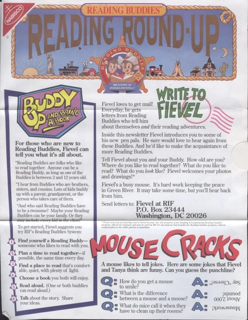 Nabisco had an exclusive deal with Reading is Fundamental at the time Fievel Goes West premiered in theaters. As stated in an article by the New York Times on November 22, 1991: